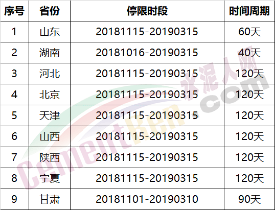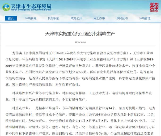 山东省经信委和环保厅联合发布《关于组织实施2018-2019年度重点行业秋冬季差异化错峰生产的通知》。通知要求:错峰生产实施时间原则为2018年11月15日至2019年3月15日,各市根据采暖期空气质量改善和重污染天气预测情况,可适当缩短或者延长错峰生产时间,但错峰生产实施时间最短不得少于两个月,且必须包含2018年12月和2019年1月。