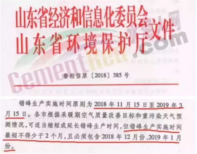 二月中旬的时候山东枣庄枣庄市生态环境局及枣庄市工业和信息化局联合发布《关于补齐水泥企业错峰生产时间的通知》,要求在2018年冬季承担居民供暖、协同处置城市垃圾或危险废弃物等保民生任务未能执行秋冬季错峰生产的企业或熟料生产线,要在2019年3月16日至2019年4月30日和2019年10月1日至2019年11月14日两个时间段内,停窑补齐按70%生产负荷折算的停窑天数。
