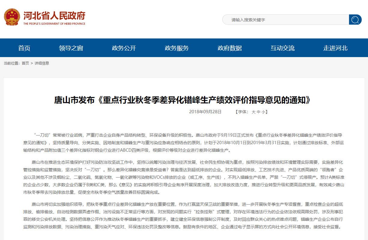 唐山市政府发布《重点行业秋冬季差异化错峰生产绩效评价指导意见的通知》,坚持质量导向、分类实施、因地制宜和错峰生产与重污染应急响应相结合的原则,计划于2018年10月1日到2019年3月31日实施,计划通过排放标准、外部运输结构和产品附加值三个差异化指标对钢业行业进行ABCD四类评级,根据评价等级对企业进行差异化错峰生产。