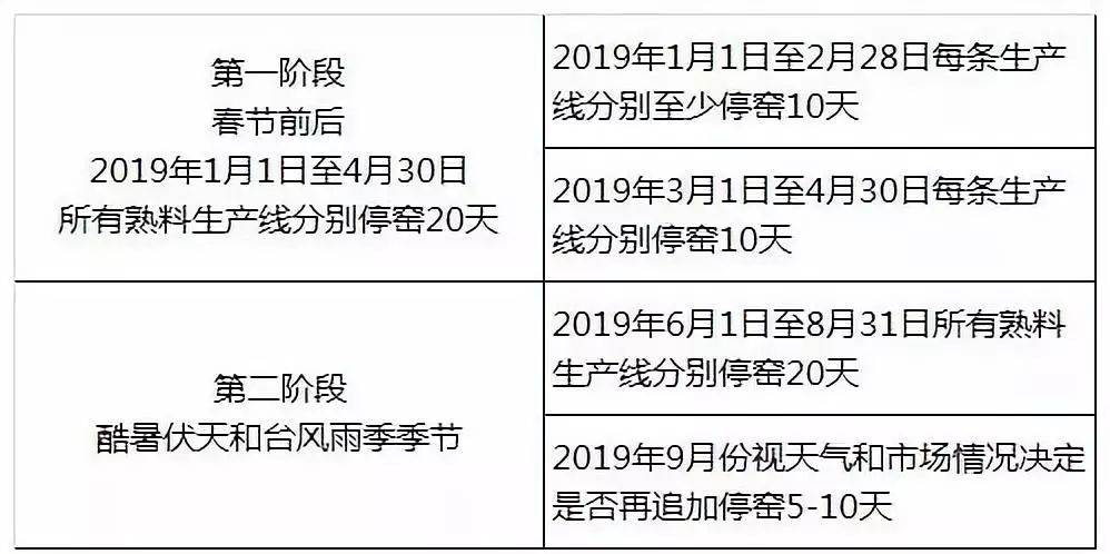 要求河南省通用水泥熟料企业行业自律,有效压减水泥行业产能过剩。自2019年3月1日起实施,具体安排如下:3月份停窑;4~5月份正常生产;6月份停窑;7~10月份正常生产;11月、12月份停窑;2020年1~2月份正常生产。