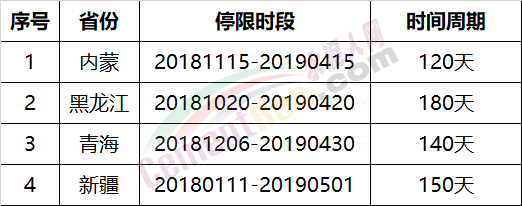新疆根据各地冬季采暖期、产能过剩和水泥市场需求情况,疆内各地错峰生产时间有所差异。另外,为实现市场动态平衡,保证市场供应,全疆各区域在去年错峰停窑的基础上再增加一至半个月错峰停窑时间,也是就说,错峰停窑分两个时间段执行。根据新疆维吾尔自治区经信委以及环保厅联合下发的《关于2018-2019年冬季水泥错峰生产的通知》要求,具体错峰停窑时间为:和田2018年12月1日至2019年3月1日、2019年4月1日至2019年5月1日共计4个月;喀什、克州2018年11月1日至2019年3月1日、2019年4月1日至2019年5月1日共计5个月;阿克苏、巴州2018年11月1日至2019年4月1日、2019年5月1日至6月1日共计6个月;其他地州市2018年11月1日至2019年5月1日、2019年6月1日至2019年7月1日,共计7个月。
