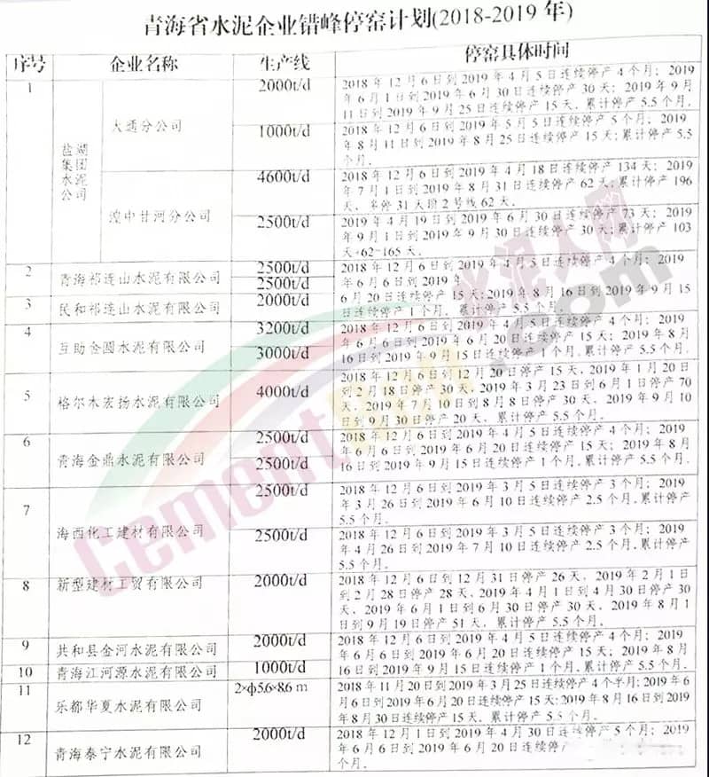辽宁省工信委和辽宁环保厅联合下发的《关于辽宁省2018-2019年采暖期水泥错峰生产安排的通知》要求,自2018年11月1日至2019年3月31日,辽宁省内所有水泥熟料生产原则上都应进行错峰生产,其中大连地区停窑时间自2018年11月5日至2019年4月5日。对承担居民供暖、协同处置城市生活垃圾及有毒有害废弃物任务的生产线原则上可以不进行错峰,但要适当降低水泥生产负荷。