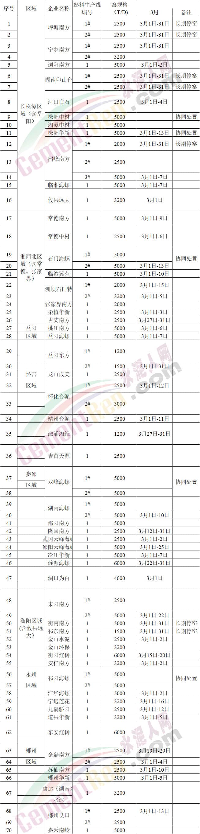 湖南省经信委、省环保厅下达了湖南省大气污染防治特护期(第四季度)水泥企业错峰生产计划的通知,文件中可以数出水泥企业共55家,熟料生产线共70条,其中5条生产线不参与错峰。