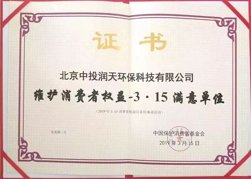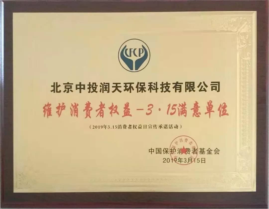 北京中投润天环保荣获3.15维护消费者权益满意单位