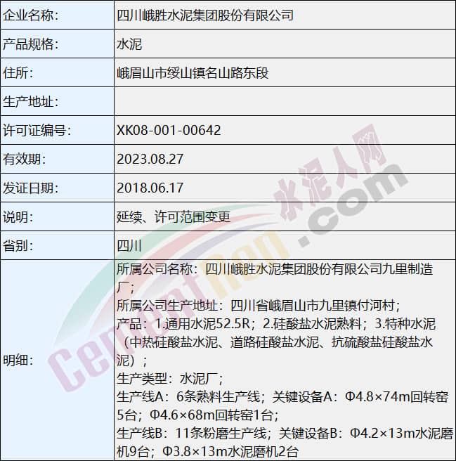 四川峨胜水泥集团股份有限公司生产许可证信息
