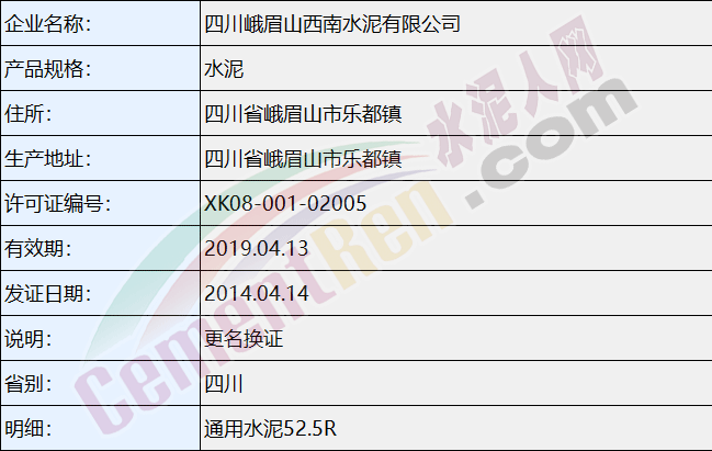 四川峨眉山西南水泥有限公司生产许可证信息