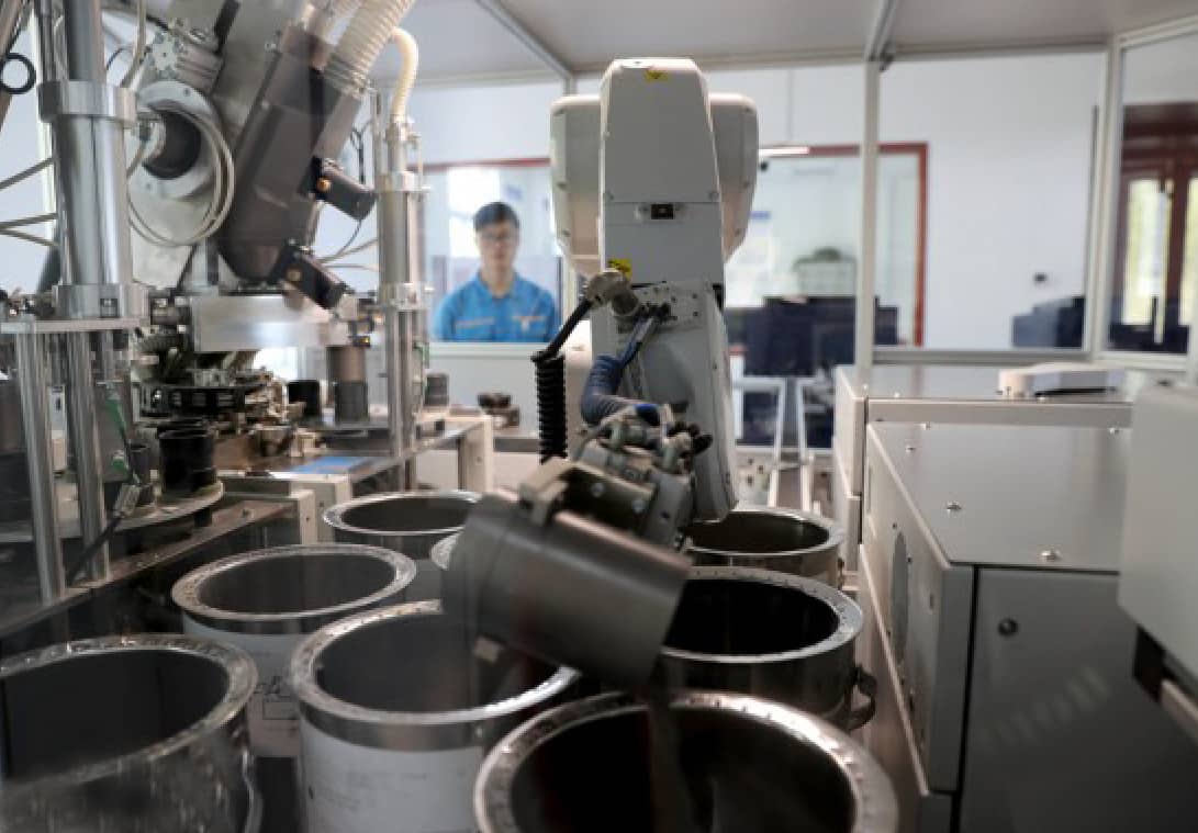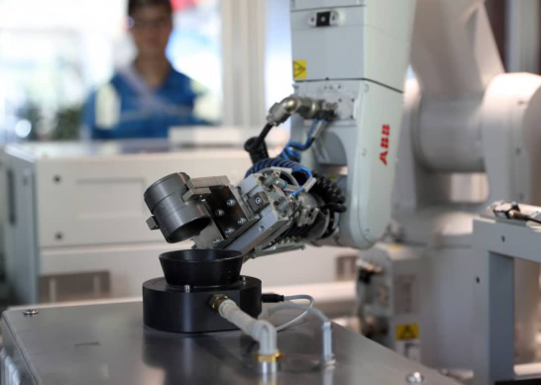 图:在安徽全椒海螺水泥有限责任公司智能工厂,机器人在实时不间断检测样品质量