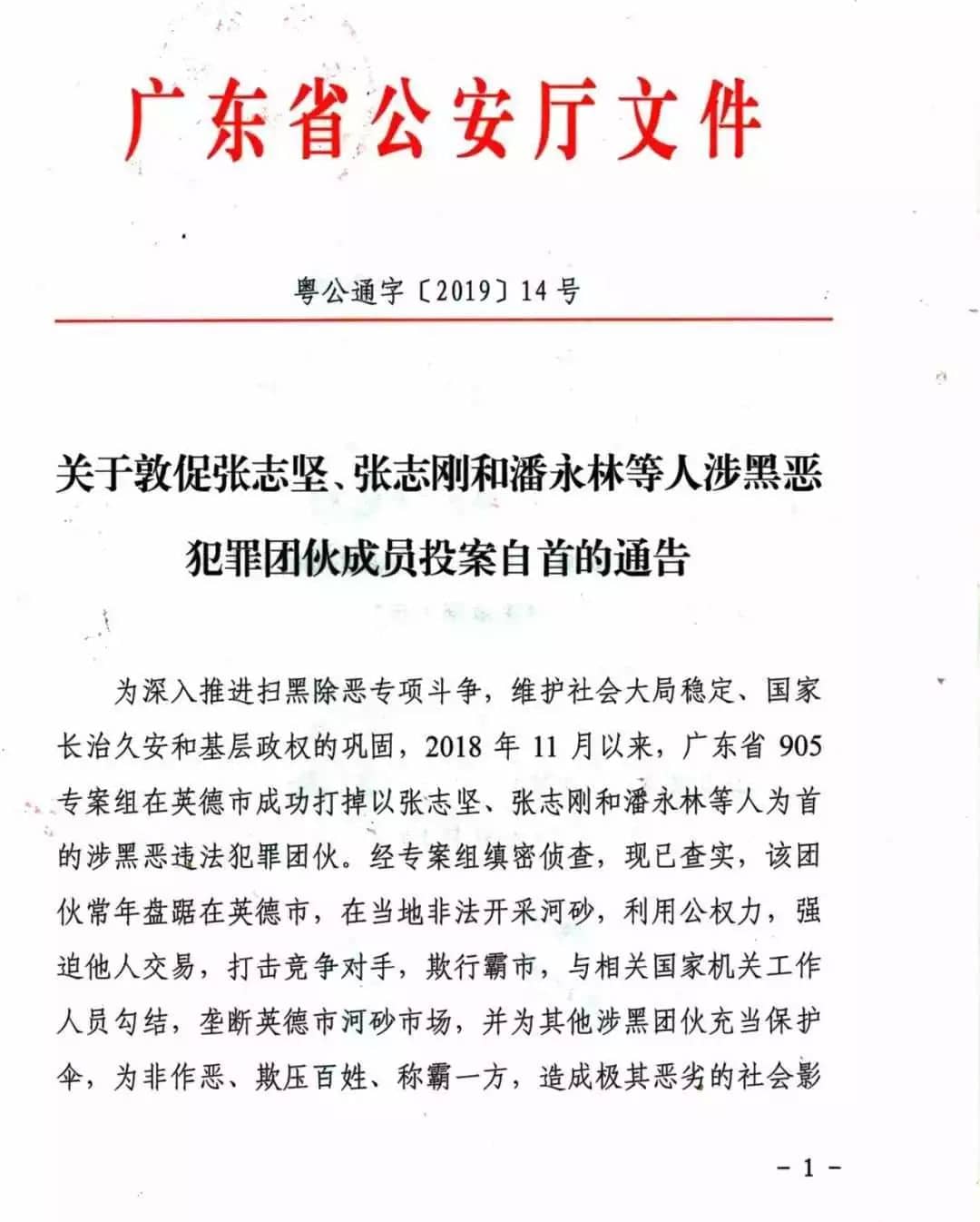2018年11月15日,专案警示教育暨敦促投案自首动员大会在英德市公安局召开,同时在英德市张贴由省公安厅发布的《关于敦促张志坚、张志刚和潘永林等人涉黑恶违法犯罪团伙成员投案自首的通告》,深入群众开展宣传攻势,形成强大的震慑。动员会前后,清远市公安系统5名干警和1名监狱系统民警相继向组织主动投案。