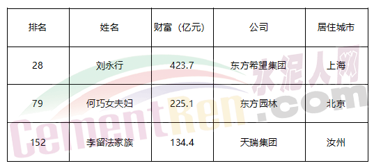 水泥行业天瑞水泥李留法家族入围 ,排名第152位,财富134.4亿元。
