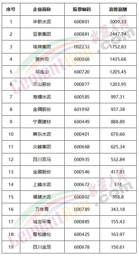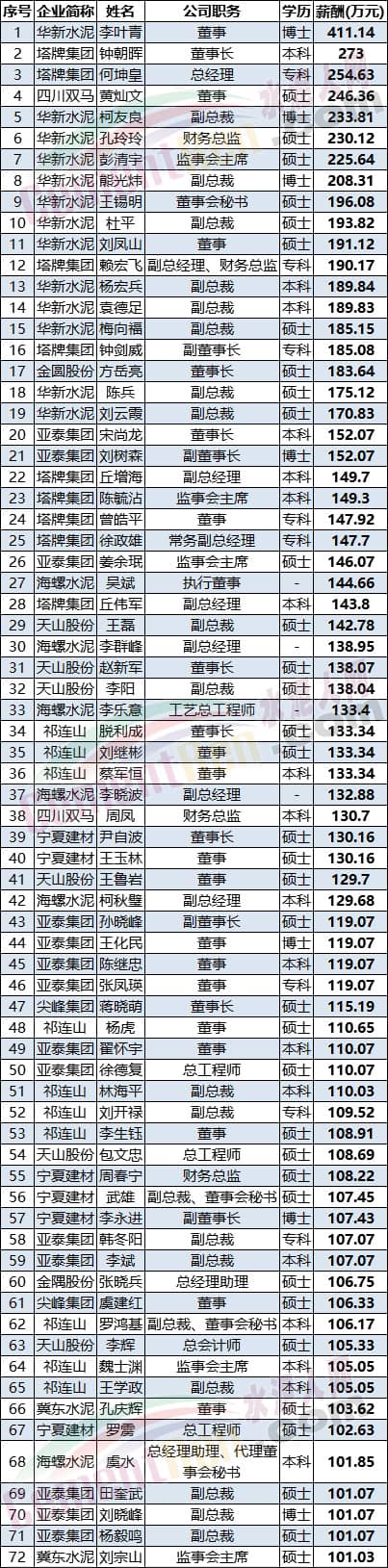 在水泥行业利润大涨的同时,各上市公司高管薪资也有所提升。据不完全统计,上市企业百万薪酬高管共七十二位。其中华新水泥李叶青以薪酬411.14万元排名年薪过百万上市公司高管第一名。塔牌集团董事长钟朝晖以薪酬273万元排名第二位,塔牌总经理何坤皇以254.63排名第三位。