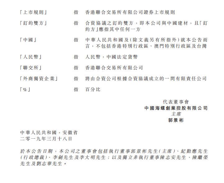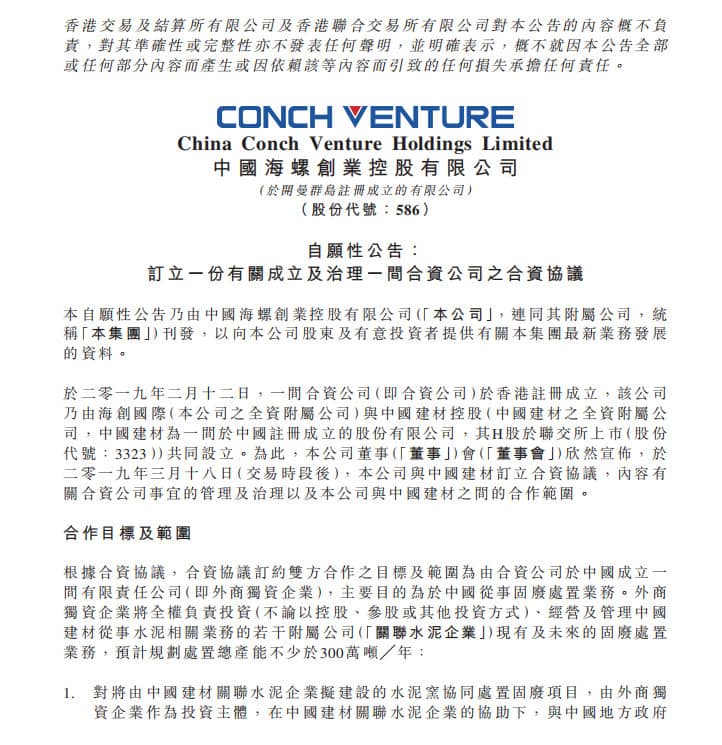 海螺创业(0586.HK)2019年3月18日晚公告,公司与中国建材设立合资企业,利用中建材水泥窑资源经营水泥窑危废固废处置,公司与中建材各持股50%,未来由公司并表。此举将促使公司独占中建材优质水泥窑资源,产能空间至少翻倍达到600万吨/年以上并保证高利率水平运行。