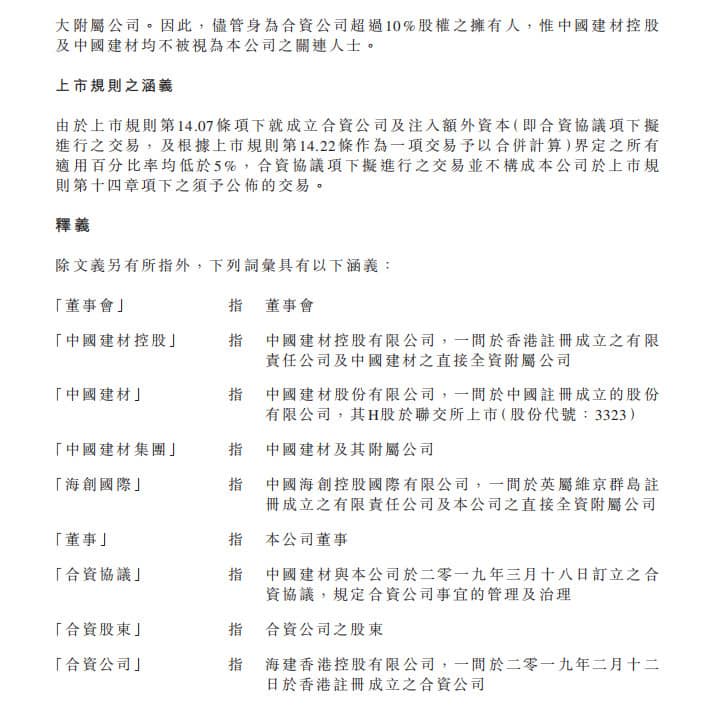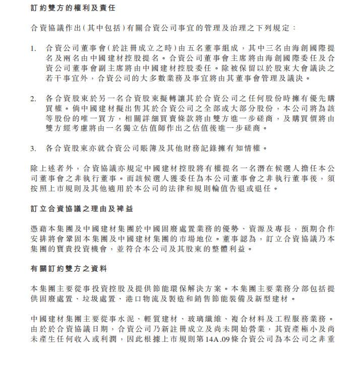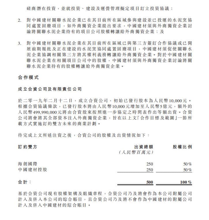 公告声明,合资公司不仅将独占中建材待开发的水泥窑资源,同时有权力获得中建材已建项目的股权,而对于与第三方合作的协同处置项目,合资公司也有权力继承中建材股权并由中建材督促第三方将其股权转让给合资公司,由此未来合资公司将独占中建材相关的的协同处置项目和待开发水泥窑资源。现有及未来的固废处置业务总产能将不少于300万吨╱年。