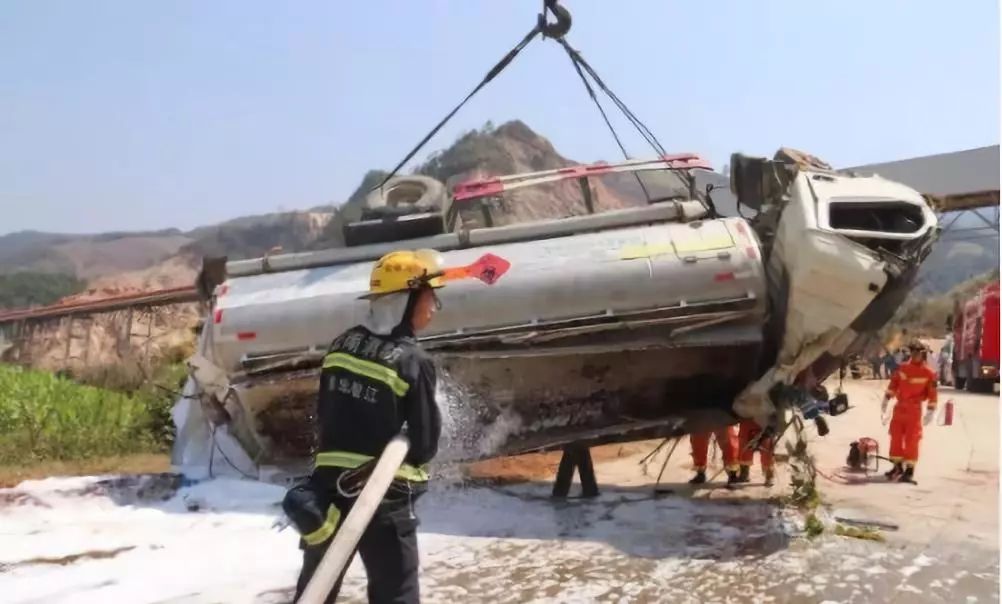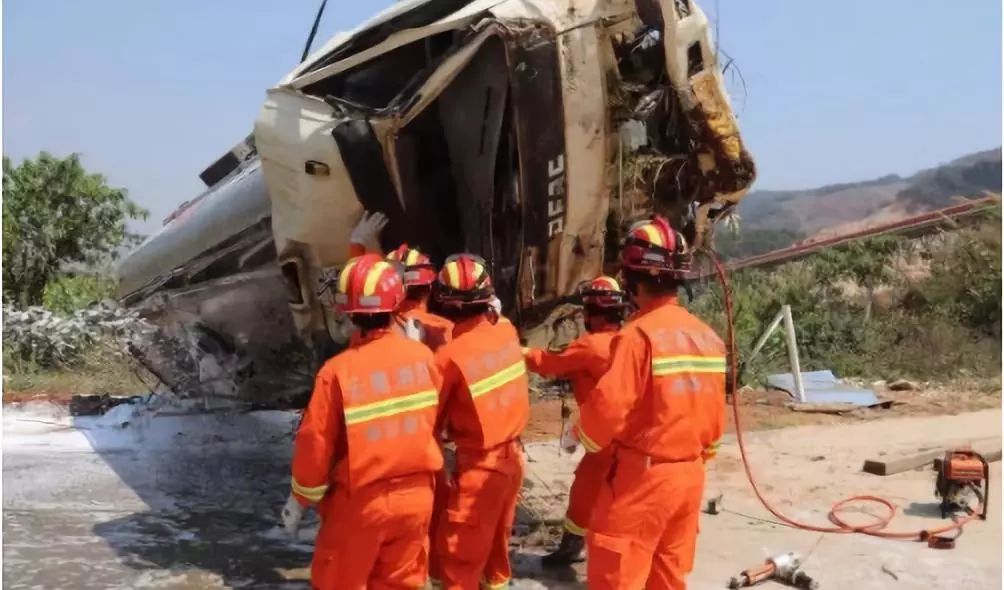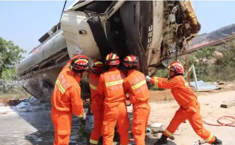 13时07分,救援人员到达现场后,见一辆油罐车四脚朝天、油还不停的一直在漏,经询问现场得知:1辆满载汽油的油罐车因刹车失灵撞至路边,驾驶室严重变形,导致油罐车内一名人员被困,了解情况后,中队指挥员迅速下达战斗命令:灭火组利用泡沫液对罐体进行冷却,攻坚组立即使用破拆工具组对车体进行破拆;警戒组负责现场做好警戒,防止发生二次事故。