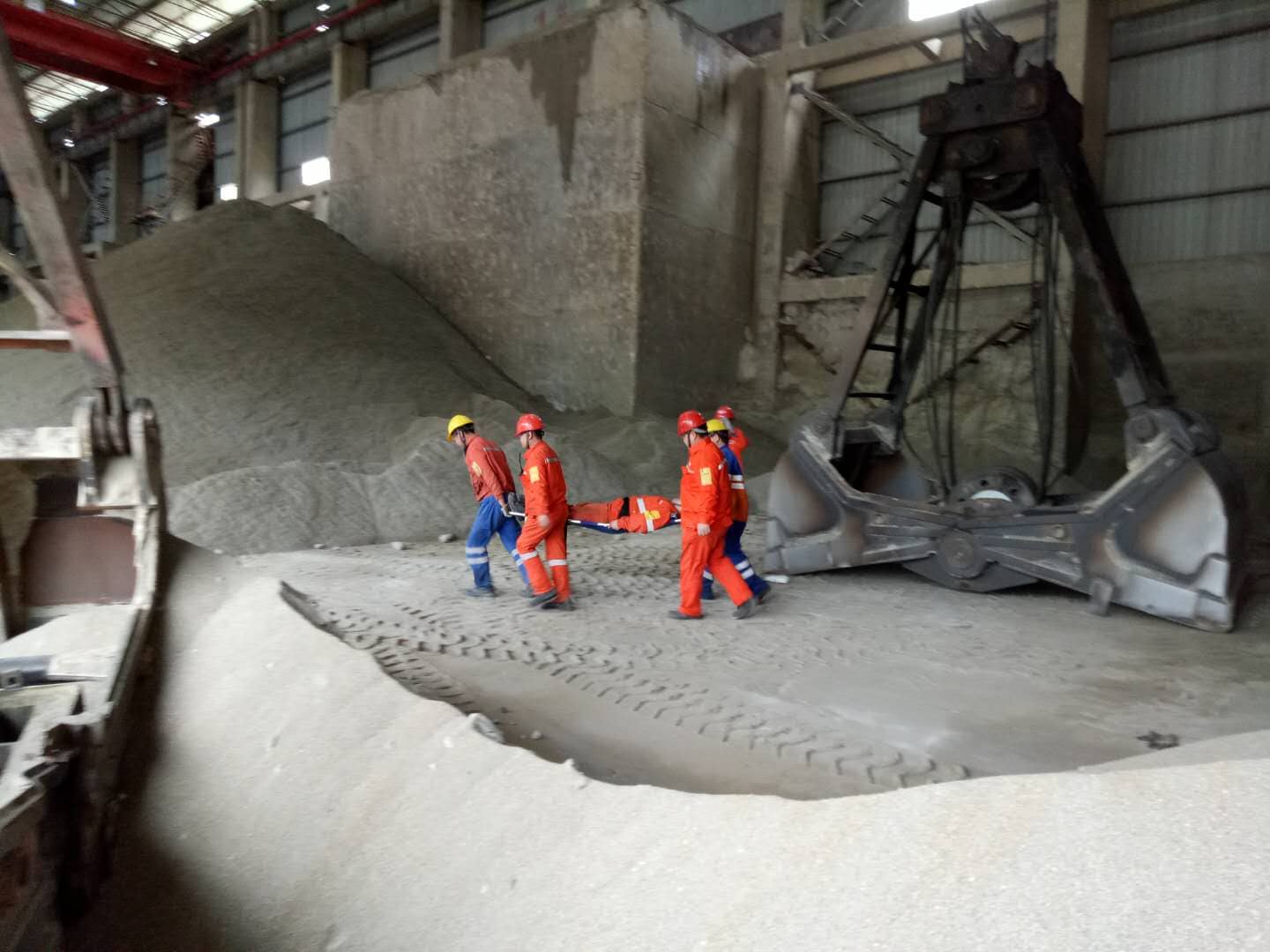 “事故”发生后,现场安全员立即向安全部长紧急报告。该公司迅速启动了班组、部门、公司三级应急救援预案,安全部长迅速通知危险源控制组、安全救援组和医疗救护组人员紧急集合,第一时间展开救援行动。危险源控制组和安全救援组人员首先用鼓风机向磨机内送风、降温,同时对磨机内氧气进行检测。根据检测结果,在做好安全防护措施后,医疗救护组人员进入磨机实施救援,并用担架将“事故”人员抬到空旷通风处,进行现场急救,同时拨打当地“120”赶往现场救援。整个演练过程紧张有序,各应急救援小组在争分夺秒的同时,处置环节配合默契,在最短的时间内完成了从事故发生、自救和启动三级应急联动、人员疏散及搜救、物资回收等过程。演练结束后,安全部长向各位员工详细讲解了进入磨机作业前的安全准备事项和作业步骤、气体检测仪等安全设备和器材的使用、防护用具的穿戴方法、事故发生后的报告程序等。同时,安全部将对本次演练进行总结,及时查找漏洞和不足,以便在今后的工作中加以改进。