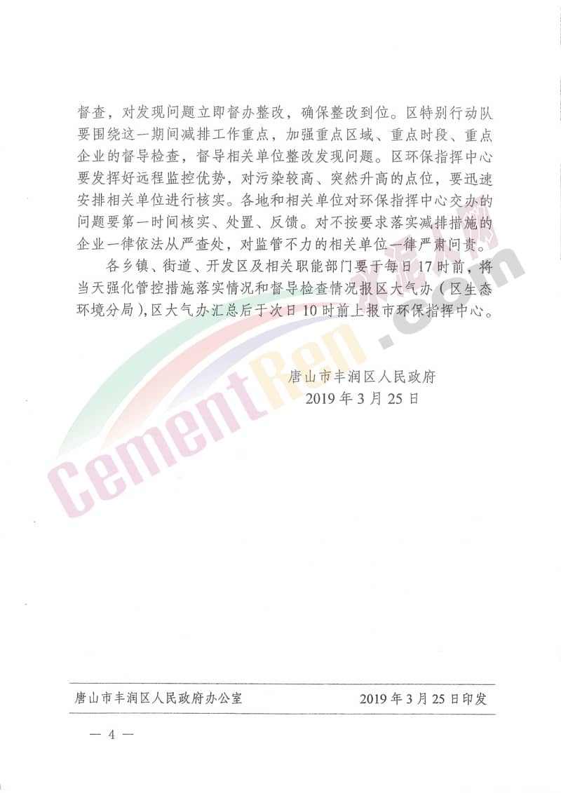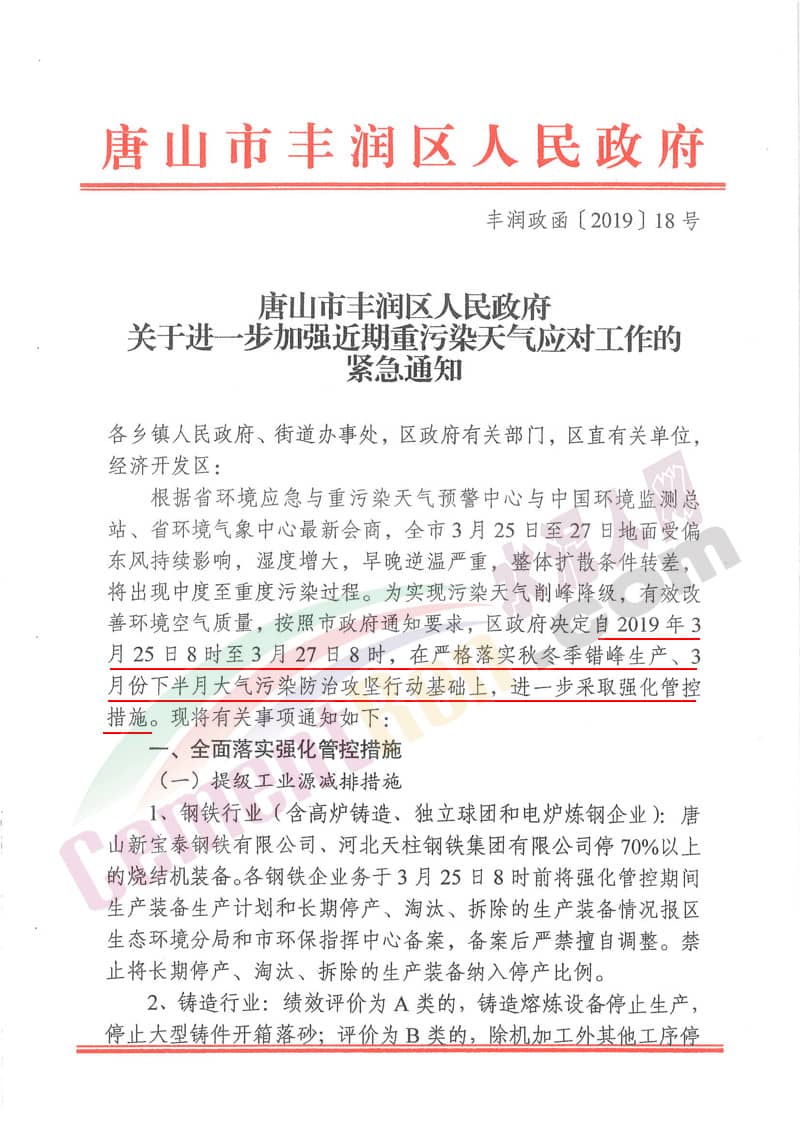 水泥人网消息:昨日(3月25日)唐山市丰润区人民政府发布丰润政函【2019】18号文件《关于进一步加强近期重污染天气应对工作的紧急通知》称,3月25日至27日受不利气候因素影响,将出现中度至重度污染过程,市政府决定自2019年3月25日8时至3月27日8时,在严格落实秋冬季错峰生产、3月份下半月大气污染防治攻坚行动措施的基础上,进一步采取强化管控措施。