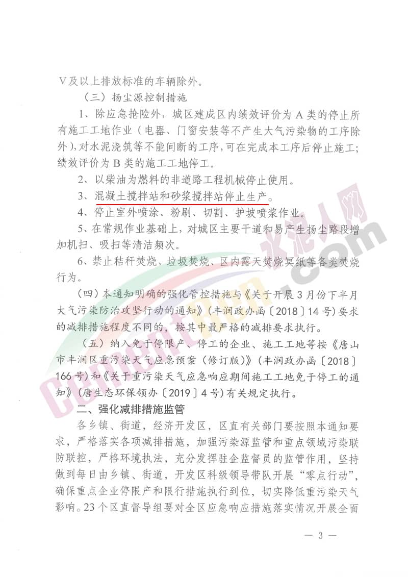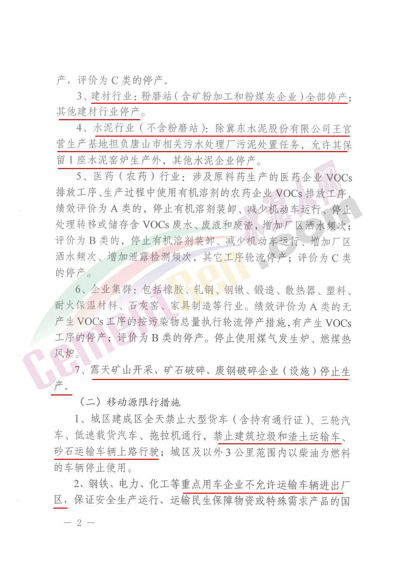 建材行业:粉磨站(含 矿粉加工和粉煤灰企业)全部停产;其他建材行业停产;水泥行业(不含粉磨站):除冀东水泥股份有限公司王官营生产基地担负唐山市相关污水处理厂污泥处置任务,允许其保留1座窑炉生产外,其他水泥企业停产;矿山开采等:露天矿山开采、矿石破碎、废钢破碎企业(设施)停止生产;移动源方面:禁止建筑垃圾和渣土运输车、砂石运输车辆上路行驶 ;重点用车企业不允许运输车辆进出厂区;扬尘源控制措施方面,混凝土搅拌站和砂浆搅拌站停止生产。通知文件原文如下: