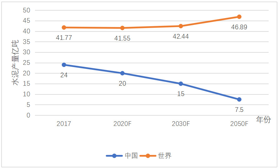 2030年和2050年,世界水泥总产量将分别为42.5亿吨和46.9亿吨,2050年比2017年增加12.2%;中国则分别为15亿吨和7.5亿吨,相应地减少68.8%。因为这段时期在全世界范围内,水泥需求仍处于缓慢上升阶段,但是中国自2018年开始,水泥需求将逐渐趋于下行。
