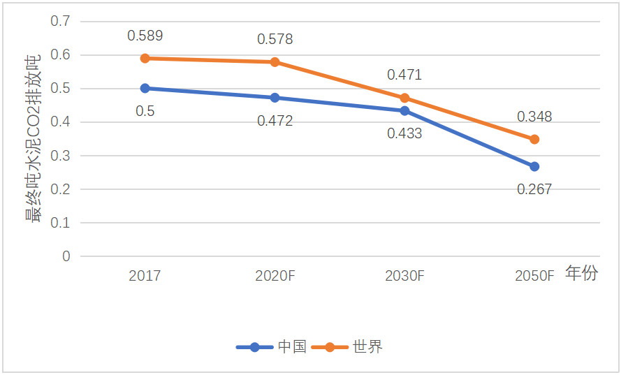 2030年和2050年,世界水泥工业吨水泥二氧化碳排放量,将分别为0.471吨,和,0.348吨,2050年比2017年减少40.9%;中国则分别为0.433吨和0.267吨,相应地减少46.7%。可以看出,2050年,中国的这项指标,比世界均值先进不少,主要是得益于CCS技术在中国的发展应用较广。