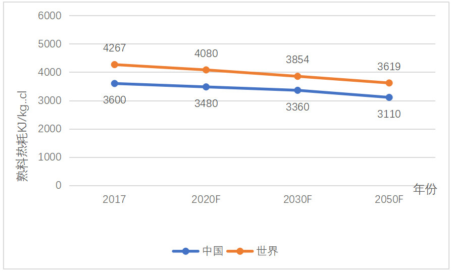 kJ/kg,2050年比2017年降低15.2%; 中国则分别为3360 kJ/kg和3110 kJ/kg,,相应地降低13.6%。同样2050年,中国的熟料单位热耗比世界均值先进不少,低13.9%,主要是熟料烧成技术装备已处于领先水平。