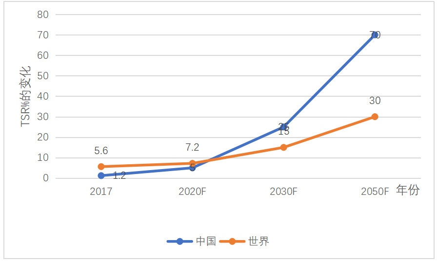 2030年和2050年,世界TSR分别为15% 和30%,2050年比2017年增加24.4个百分点; 中国的TSR分别为25% 和70%, 2050年比2017年增加68.8个百分点。TSR比世界均值先进得多。