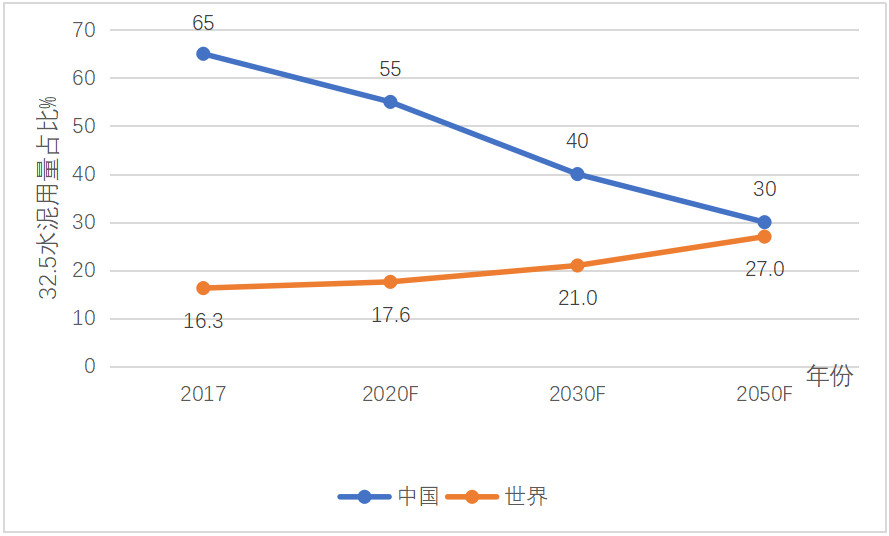 2030年和2050年,世界32.5水泥用量占比分别为21%和27%,2050年比2017年上升10.7个百分点;中国则分别为40%和30%,相应的下降35个百分点。这是中国逐步向国际先进看齐的结果。