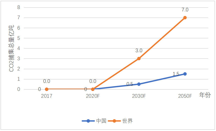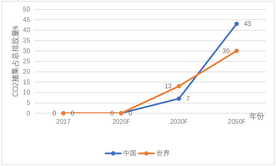 2030年和2050年,世界水泥工业二氧化碳捕集量占总排放量的比例,分别为13%和30%,中国分别为7%和43%。同样,中国比世界均值先进得多。