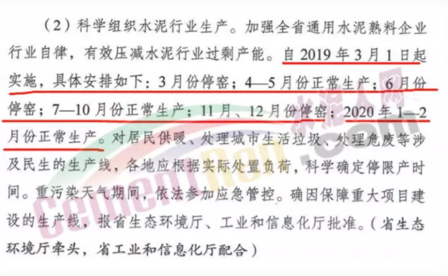 文件要求水泥行业科学组织生产,加强水泥熟料企业自律,有效压减水泥行业过剩产能。自3月1日起停窑限产,4、5月正常生产,6月停限,7-10月正常生产,11、12月停窑。共计停限4个月,加上2019年1、2月份的停窑限产,河南省2019年也要停限产6个月(180天)以上。