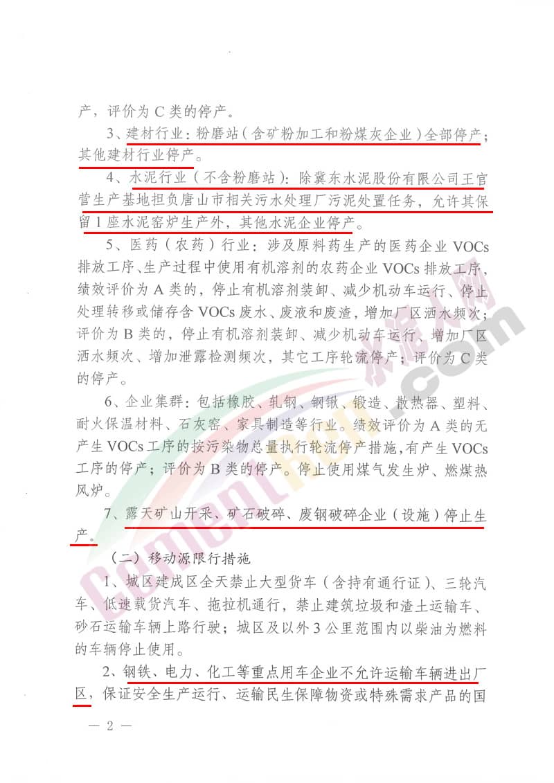 其中,建材行业,粉磨站(含矿粉加工和粉煤灰企业)全部停产;其他建材行业停产。水泥行业(不含粉磨站),除冀东水泥股份有限公司王官营生产基地担负相关污泥处置任务,允许其保留一座水泥窑炉生产外,其他水泥企业停产。露天矿山开采,矿石破碎,等企业设施停产。
