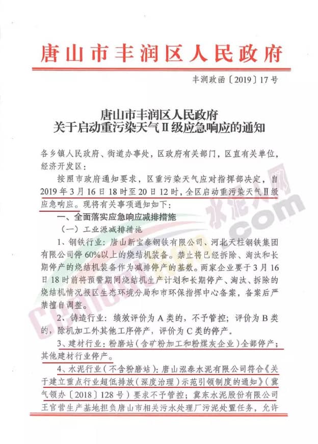 这已经是进入3月后的第二次临停了。3月16日,丰润区人民政府办公室曾发布【2019】17号文件《关于启动重污染天气II级应急响应的通知》,要求自3月16日18时至20日12时,全区启动重污染天气II级响应措施,建材行业粉磨站(含矿粉加工和粉煤灰企业)全部停产。水泥行业(不含粉磨站)唐山泓泰水泥有限公司污染符合相关要求不予管控、冀东水泥王官营生产基地担负污水处理长污泥处置任务,允许运行2条生产线。唐山飞龙有限责任公司,唐山燕东水泥有限责任公司根据承担供暖任务核实最大生产。其他企业停产。