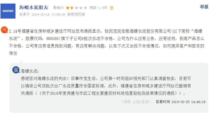 日前,有投资者向海螺水泥(600585)提问,2.14号福建省住房和城乡建设厅网站发布通报显示,检测发现安徽海螺水泥股份有限公司(以下简称“海螺水泥”,股票代码:600585)旗下子公司6批次水泥不合格。公司为什么没有公告,没有说明,到底产品怎么不合格,公司有没有追责找到问题,有没有解决问题,以免下次又出现不合格情况,如何挽回客户和股东的信任。
