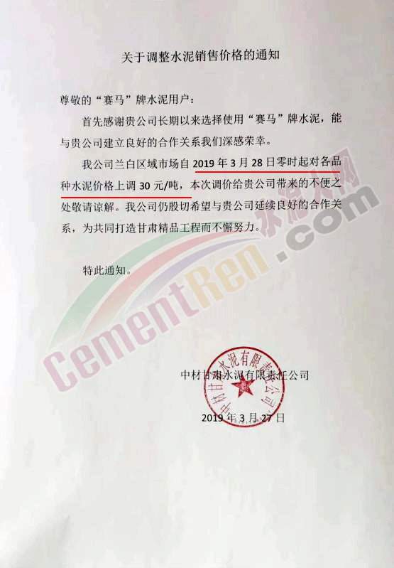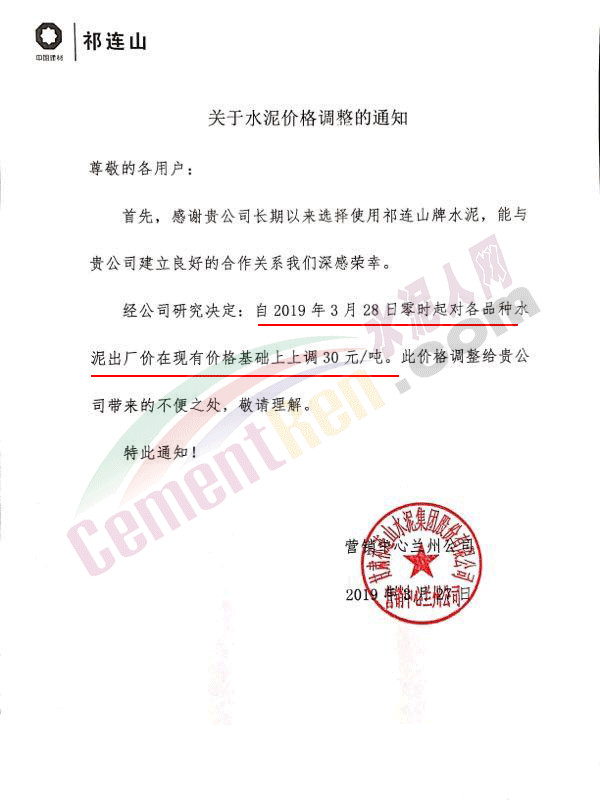 甘肃祁连山水泥集团股份有限公司营销中心兰州公司调价通知称,自今日(3月28日)零时起对各品种水泥出厂价在现有价格基础上上调30元/吨。