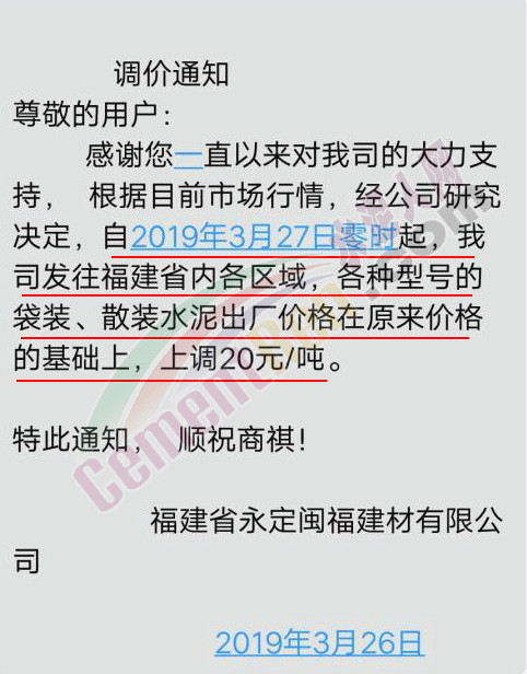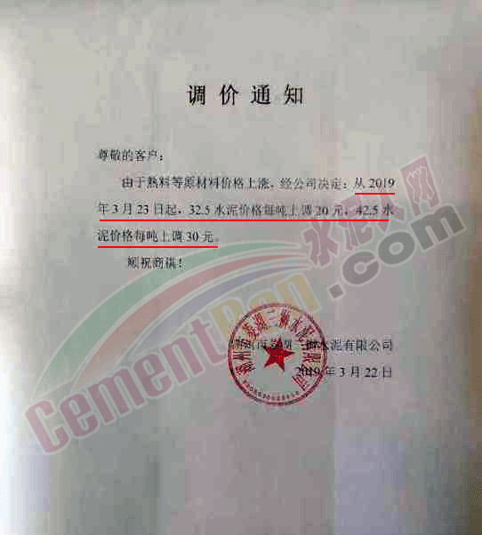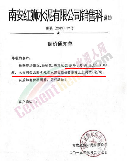 南安红狮水泥有限公司调价通知称,根据市场情况 ,经研究决定从2019年3月28日上午7点起,各品种各规格水泥在原价格基础上上调20元/吨。