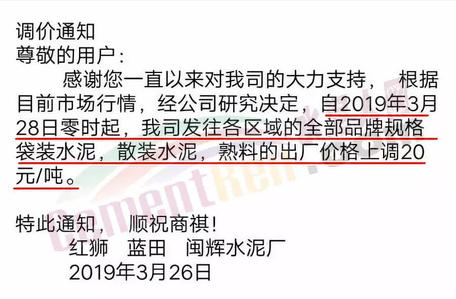 红狮 蓝田 闽辉水泥厂调价通知称,根据目前市场行情,经公司研究决定,自2019年3月28日零时起,公司发往各区域的全部品牌规格袋装水泥,散装水泥,熟料的出厂价格上调20元/吨。