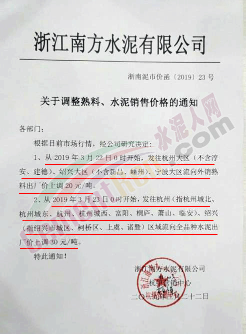 浙江南方水泥有限公司杭绍营销中心调价通知称,根据目前市场行情,经公司研究决定: