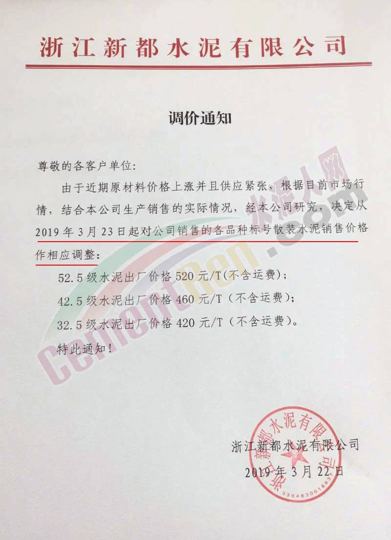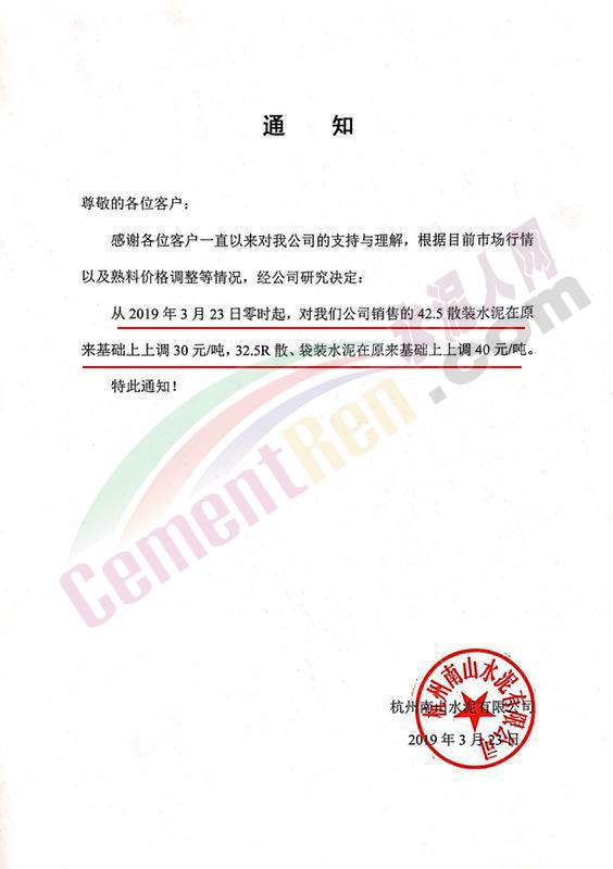 杭州南山水泥有限公司通知称,从3月23日零时起,对我们公司销售的42.5散装水泥在原来基础上上调30元/吨,32.5R散、袋装水泥在原来基础上上调40元/吨。