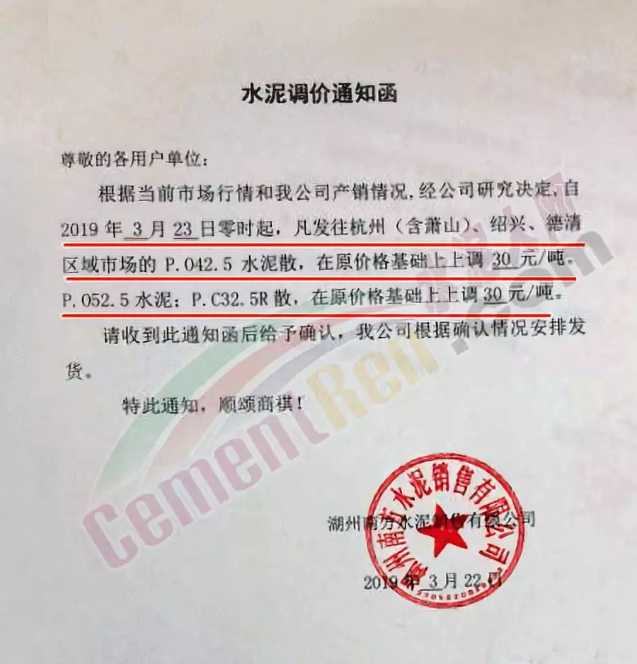 湖州南方水泥销售有限公司水泥高价通知函称,根据当前市场行情和我公司产销情况,经公司研究决定 ,自3月23日零时起,凡发往杭州(含萧山)、绍兴、德清区域市场的P.O42.5水泥散,在原价格基础上上调30元/吨。P.O52.5水泥,P.C32.5R散,在原价格基础上上调30元/吨。
