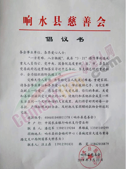 记者致电这份《倡议书》上的联系人,对方表示,该倡议书确为慈善会所发,用于接受爱心款物,帮助“3·21响水爆炸事件”中受灾群众献上爱心,渡过难关。该倡议书留下的募款卡号即为响水县慈善会接受善款的对公账号,捐款时可以写明指定用于“3·.21响水爆炸事件”。