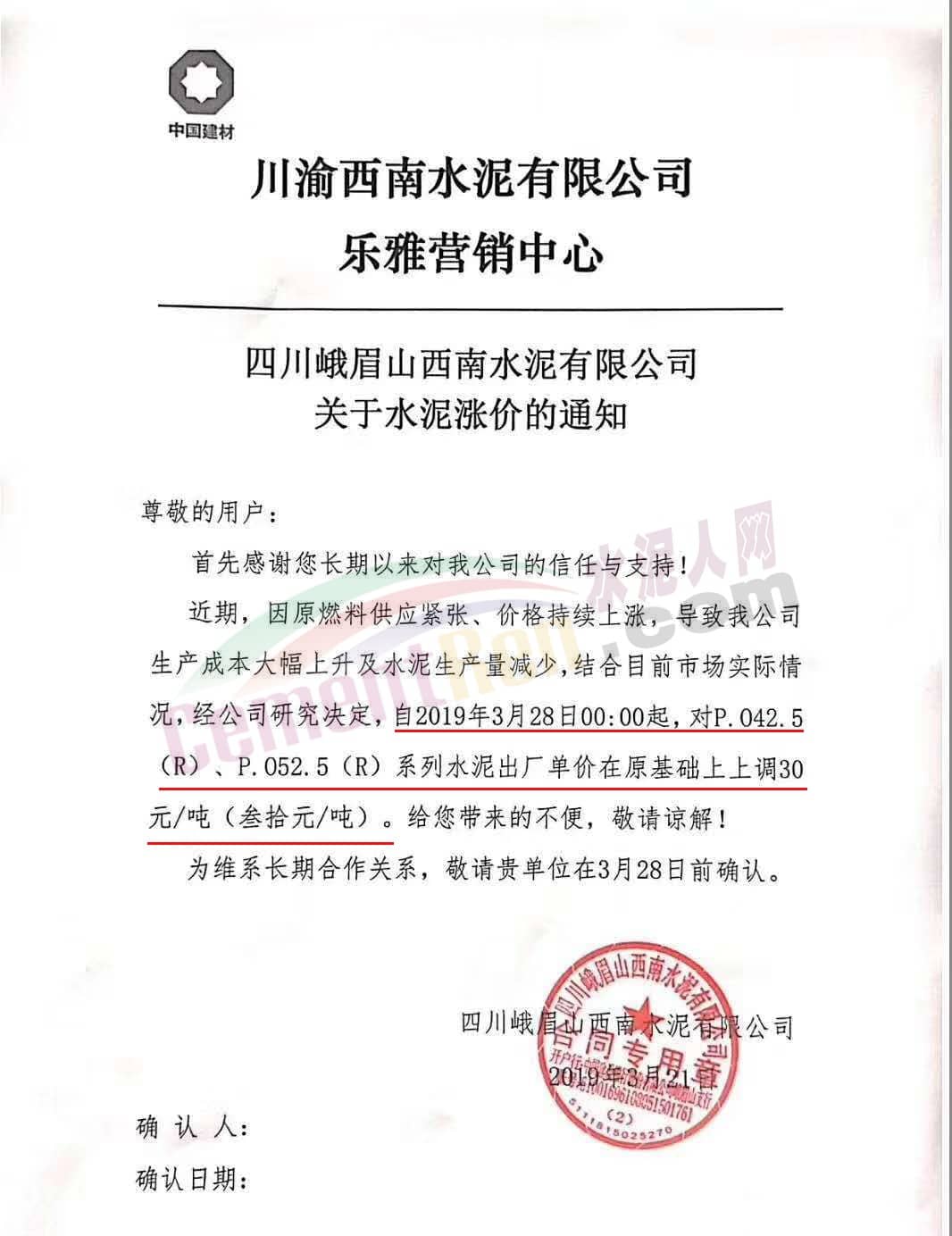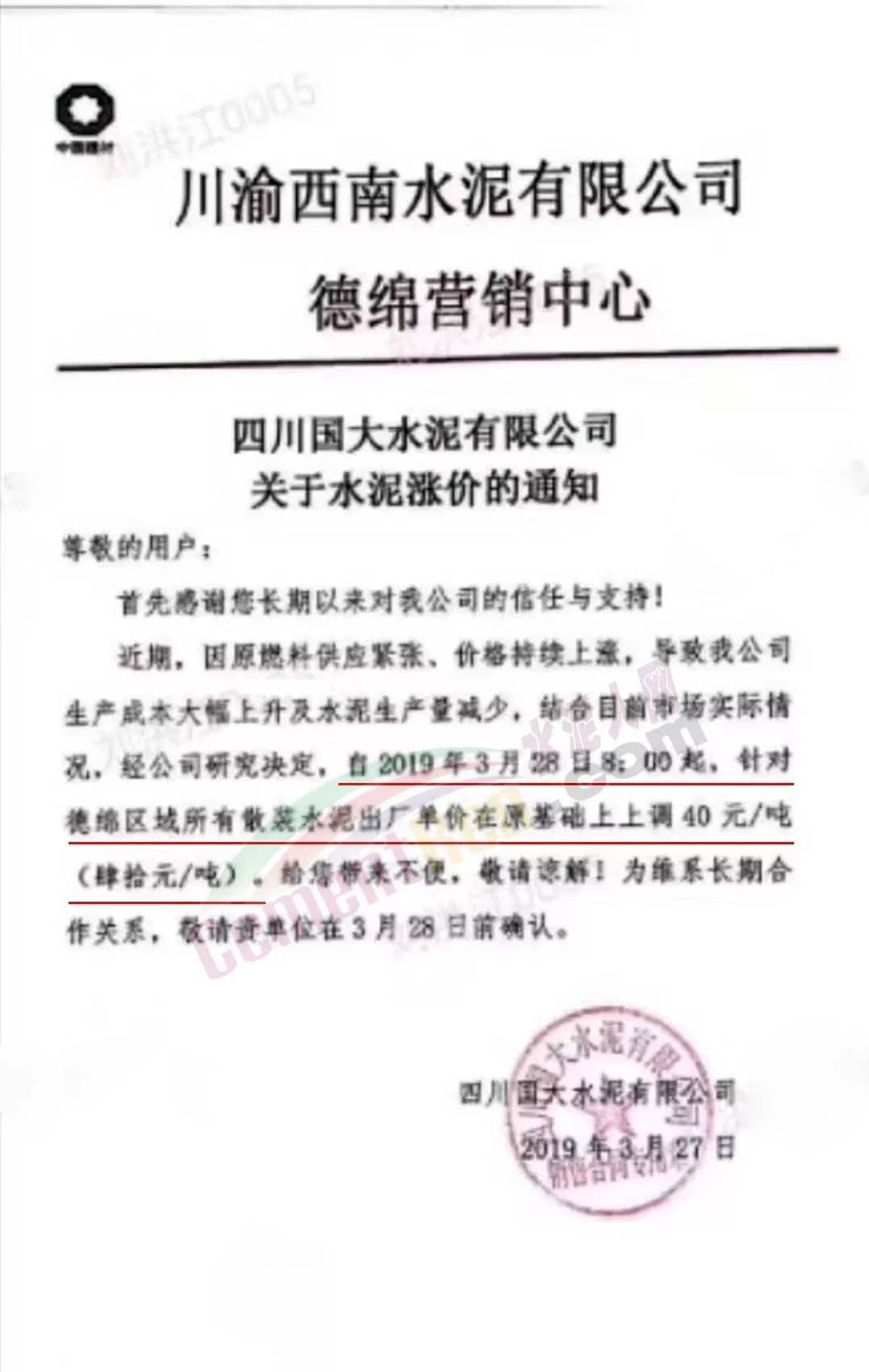 同期,川渝西南水泥旗下多个企业也通知自今日(3月有28日)起上调水泥价格。