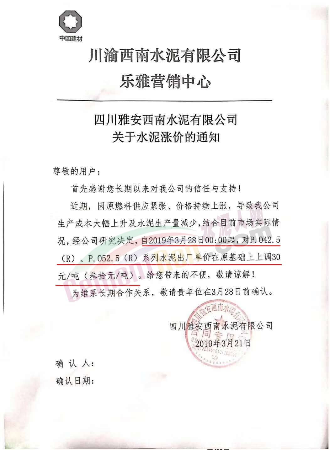 四川雅安西南水泥有限公司涨价通知称,因原燃料供应紧张,价格持续上涨,导致公司生产成本大幅上升及水泥生产量减少,结合目前市场实际情况,公司决自今日(3月28日)00:00起,对P.042.5(R)、P.052.5(R)系列水泥出厂单价在原基础上上调30元/吨。