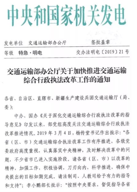 近日,交通运输部办公厅下发特急明电,要求加快推进交通运输综合行政执法改革工作。