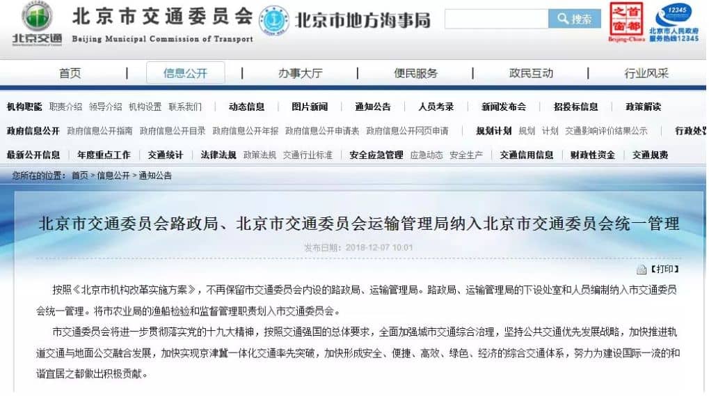 北京市交通委员会去年12月7日便下发了《北京市机构改革实施方案》,不再保留北京市交通委员会内设的路政局、运输管理局。