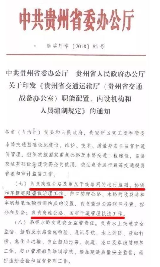贵州省印发交通运输厅三定方案,指出负责高速公路及重点干线路网的运行监测、协调和车辆超限超载治理工作。归口管理公路、水路的收费站和车辆超限运输检测站点的设置,负责高速公路联网收费、拆分和监督;负责高速公路、国省干道管理执法工作。由此可以理解为:贵州的高速公路、国省道管理执法工作,由省垂直管理?
