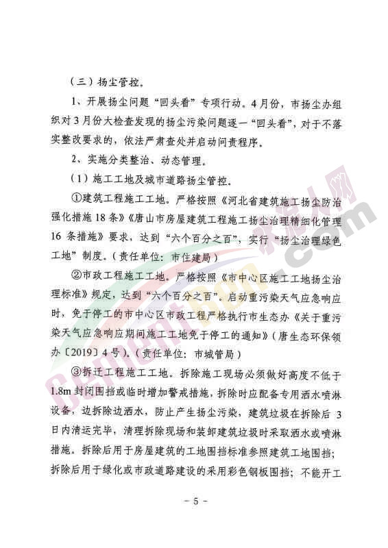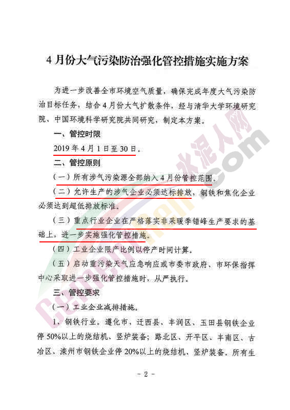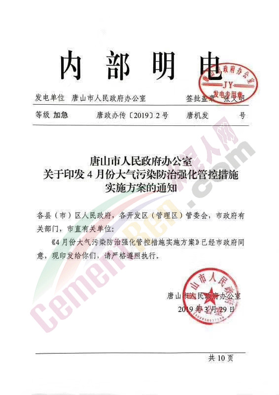 水泥人网最新消息:日前,唐山市人民政府办公室发布内部明电唐政办传【2019】2号《关于印发4月份大气污染防治强化管控措施实施方案的通知》称,《4月份大气污染防治强化管控措施实施方案》已经市政府同意。