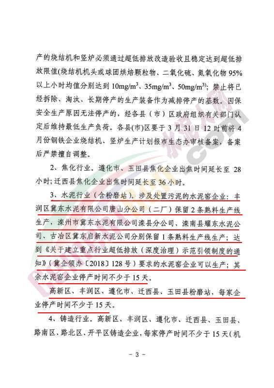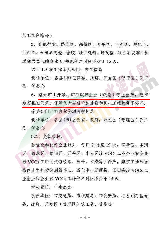 ⑸高新区、丰润区、遵化市、迁西县、玉田县粉磨站,每家企业停产时间不少于15天。