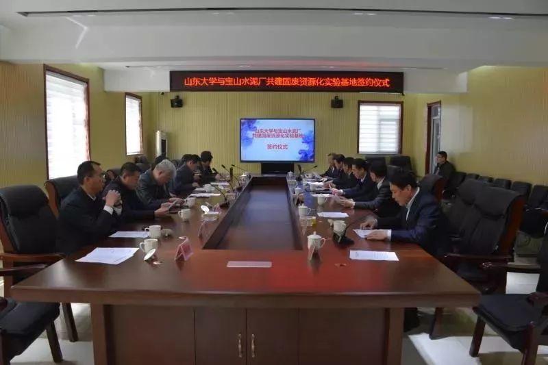 签约仪式上,淄川区副区长赵军致辞,对山东大学与宝山水泥共建固废资源化实验基地签约表示祝贺,宝山水泥厂董事长贾木海介绍了企业情况,山东大学能源与动力工程学院党委副书记滕玉军介绍了山东大学能源与动力工程学院科研情况,董勇教授介绍了燃煤污染物减排国家工程实验室情况,王文龙教授介绍了山东大学固废资源化科研情况,毛岩鹏副教授介绍了固废资源化实验基地情况,随后,与会人员一同观看了淄博晨越宝山环保科技有限公司利用水泥窑协同处置5万吨/年固体废物项目介绍PPT。