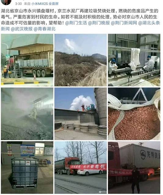 同一日来自于新浪微博的一条消息称,湖北省京山市永兴镇盘堰村,京兰水泥厂再建垃圾焚烧处理,燃烧的危废品产生的毒气,严重危害到村民的生命。如若不能及时积极的处理,势必对京山市人民的生命造成不可估量的影响,望帮助。