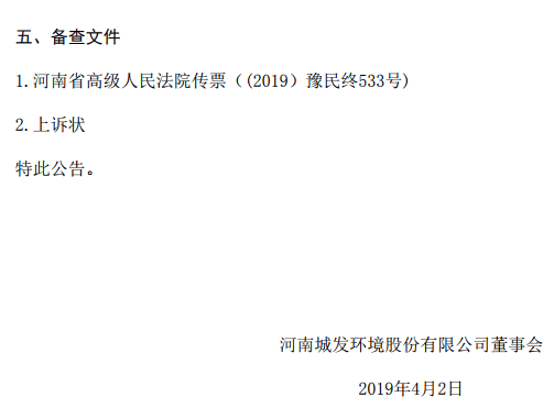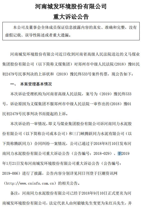 4月3日,河南城发环境股份有限公司(000885.SZ)发布(以下简称城发环境)《重大诉讼公告》(以下简称“公告”)。城发环境近日收到河南省高级人民法院送达的义马煤业集团股份有限公司(以下简称义煤集团)对郑州市中级人民法院(2018)豫01民初2479号民事判决的上诉状和 (2019)豫民终533号案件传票。