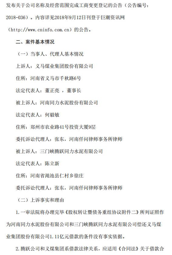 公告显示,义煤集团不服郑州市中级人民法院一审作出的(2018)豫01民初2479号民事判决书并提起上诉。义煤集团表示希望能够撤销(2018)豫01民初2479号民事判决书第一、二、三项,改判由河南同力水泥股份有限公司(以下简称“同力水泥”)和三门峡腾跃同力水泥有限公司向义煤集团偿还11100万元及利息3296.7万元。义煤集团认为,腾跃公司和义煤集团属于借款法律关系,应适用《合同法》关于借款合同相关规定调整,腾跃公司的还款不应受任何“条件”的限制。