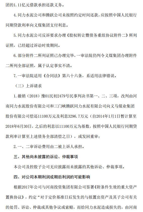 2018年7月,义煤集团诉河南同力水泥股份有限公司和三门峡腾跃同力水泥有限公司合同纠纷一案由河南省郑州市中级人民法院立案受理。郑州中级人民法院判决河南同力水泥股份有限公司在三方配合完成本判决第一项所列证照办理完毕后30日内,向三门峡腾跃同力水泥有限公司提供1.11亿元资金,由三门峡腾跃同力水泥有限公司用于偿还其对义煤集团的债务。同时郑州中级人民法院判决案件受理费由义马煤业集团股份有限公司负担和河南同力水泥股份有限公司共同负担。公告原文如下: