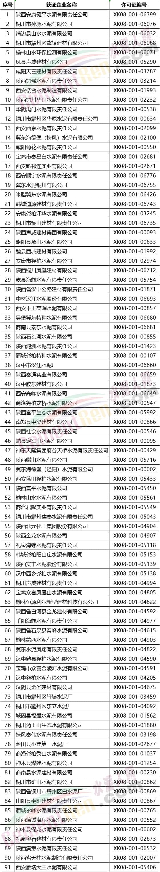 陕西省部分水泥企业名单